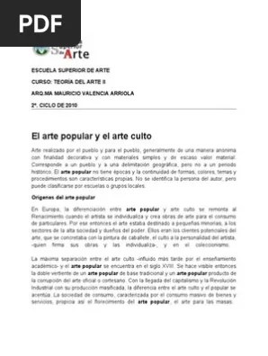 La creación artística se ha creado ha seguido dos direcciones:. 3 páginas • 1063 visualizaciones. Y creación colectiva o anónima del pueblo. Está principalmente representado en el campo de la escultura. Arte culto, individual y profesional, y arte colectivo y popular a lo largo de su historia, la creación artística ha seguido dos direcciones fundamentales: Arte culto, individual y profesional, y arte colectivo y popular. El arte cinético y el arte óptico son corrientes artísticas basadas en la estética del movimiento. Arte culto, individual y profesional, y arte colectivo y popular Arte popular objetos chilenos cabe preguntarse bajo que términos se habla de artesanía, o que entiende uno por artesanía... 4 páginas • 3960 visualizaciones.
