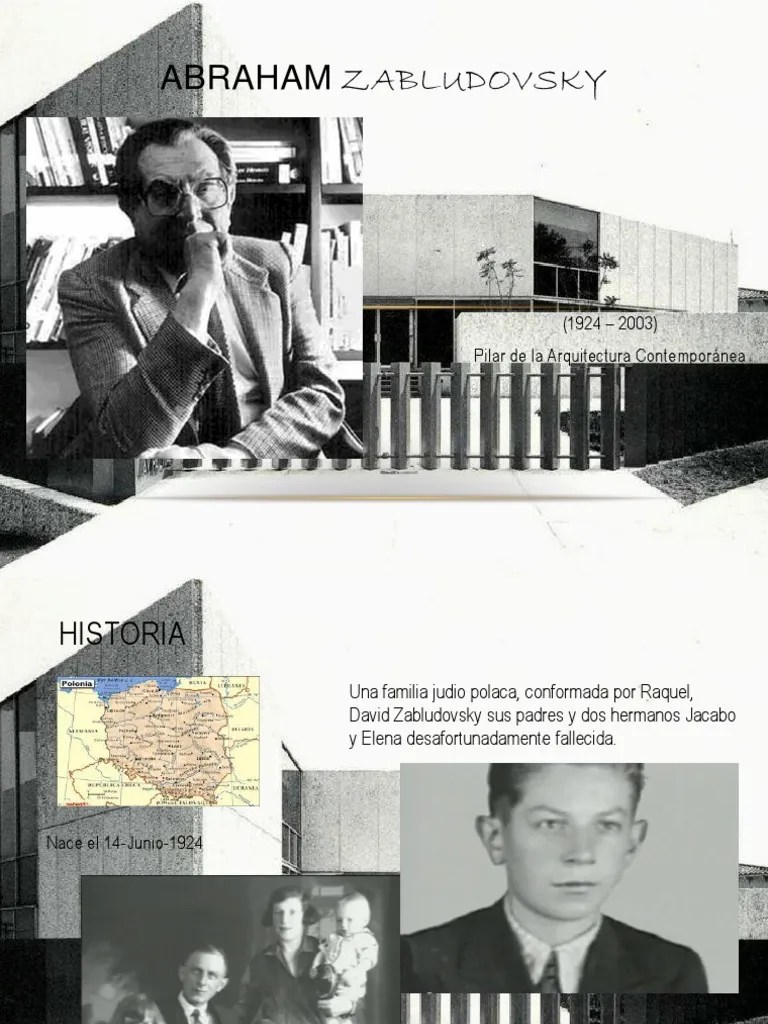 Nació el 14 de junio de 1924, en bialystok, polonia... Abraham zabludovsky, pilar de la arquitectura contemporánea mexicana. Ya como estudiante apuntaba a lo que sería más tarde: Hijo de david zabludovsky y raquel kraveski, que emigraron de polonia a méxico en 1926, cuando en europa se iniciaba la persecución de judíos. Hijo de david zabludovsky y raquel kraveski, que emigraron de polonia a méxico en 1926, cuando en europa se iniciaba la persecución de judíos. Estudió en la escuela nacional de arquitectura, en la ciudad de méxico. Con teodoro gonzález de león construyó en1975 el colegio de méxico en ajusco.. De su primera época son más de cien obras alrededor del tema de la vivienda.