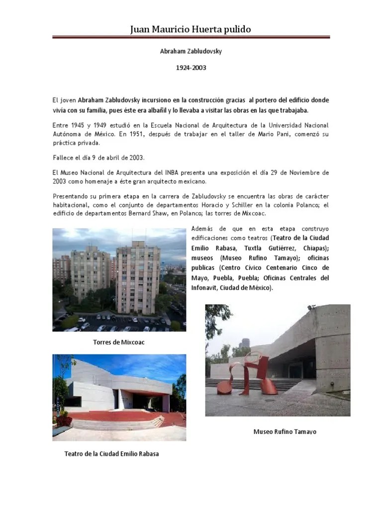 09.04.2012 · abraham zabludovsky nació el 14 de junio de en 1924 en bialystok, polonia.. Uno de los pilares más sólidos en la arquitectura contemporánea, el mexicano abraham zabludovsky, quien llegó a diseñar más de 200 obras, entre ellas el museo de arte contemporáneo rufino tamayo y la biblioteca nacional de méxico, en esta capital, murió el 9 de abril del 2003... 08.04.2013 · naturalizado mexicano en 1941, zabludovsky inició su práctica profesional en 1950, etapa en la que se ocupó del diseño de diversas casas, edificios y departamentos, y mostró un estilo contemporáneo con un acertado manejo de técnicas y materiales, lo que respondió a su preocupación por obtener resultados funcionales.